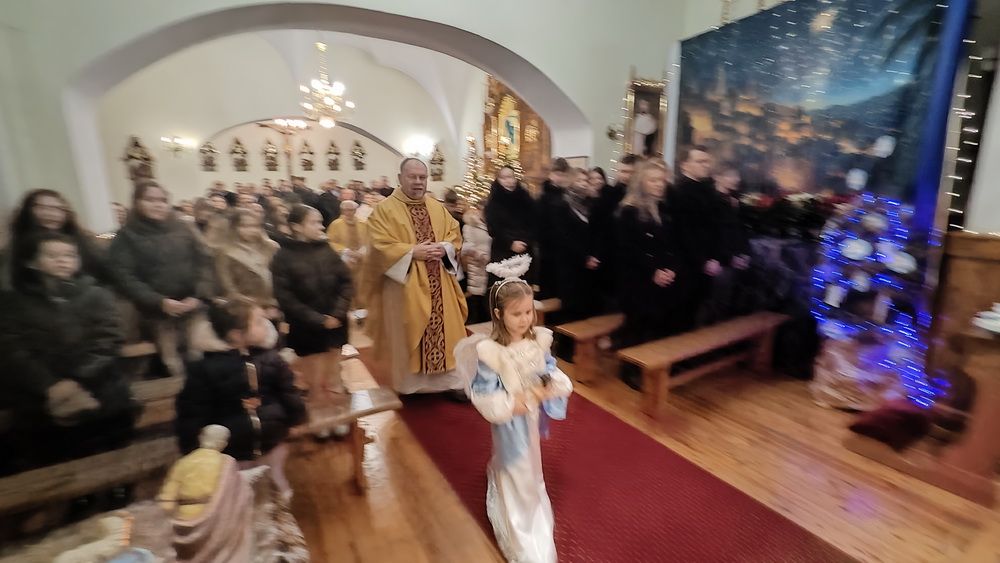 Mszą świętą pasterską o północy rozpoczęliśmy świętowanie kolejnej rocznicy narodzin naszego Zbawcy i Pana Jezusa Chrystusa, który będąc pełen potęgi i majestaty z miłości do nas zszedł na ziemię i przyjął Ciało z Maryi Dziewicy rodząc się w nędznej betlejemskiej stajence. Wspólne kolędowanie, a następnie przeżywanie Eucharystii zakończyliśmy dzieleniem się w całej wspólnocie opłatkiem i składając sobie nawzajem życzenia.